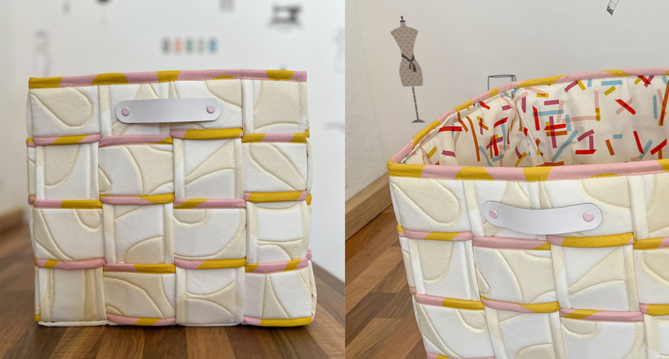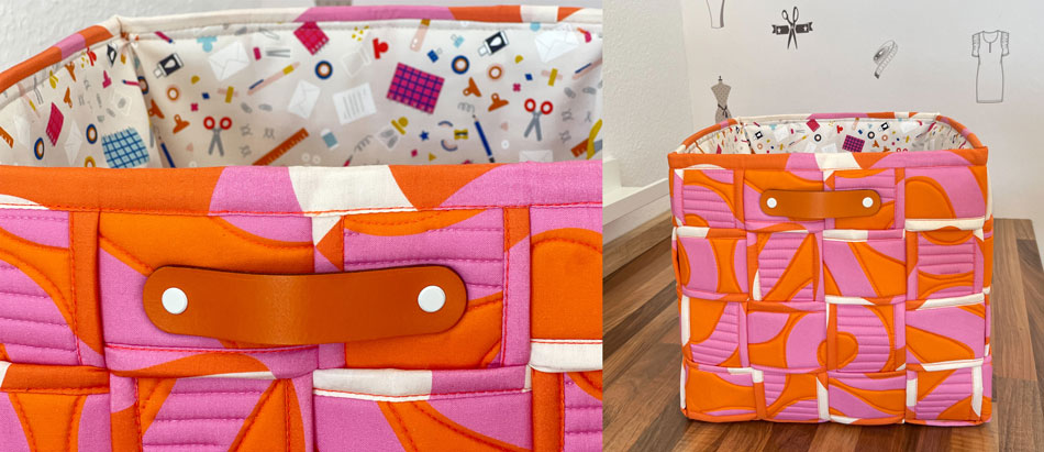 Etwas schlichter wurde der Korb aus dem Stoff Groove Unspooled Moonbeam und dem Binding mit dem Stoff Groove Unspooled Sunshine Glow.