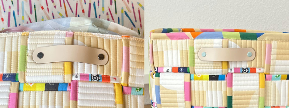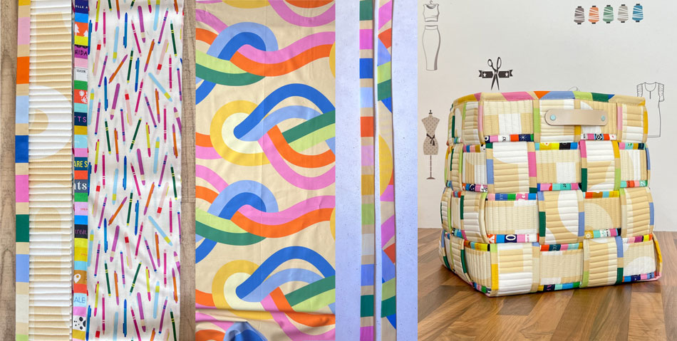 …aber nachdem die anderen beiden jetzt so schön pastellig waren, wollte ich das für den dritten Korb auch, den ich dann extra noch mal aufgetrennt habe dafür. Für diesen Korb habe ich den Stoff Groove Woven Champagne verwendet und da ich von dem gestreiften Stoff Groove Warp Luminous Multi nicht genug für das gesamte Binding hatte, habe ich noch Selvedge Magic von Ruby Star Society dazu kombiniert.