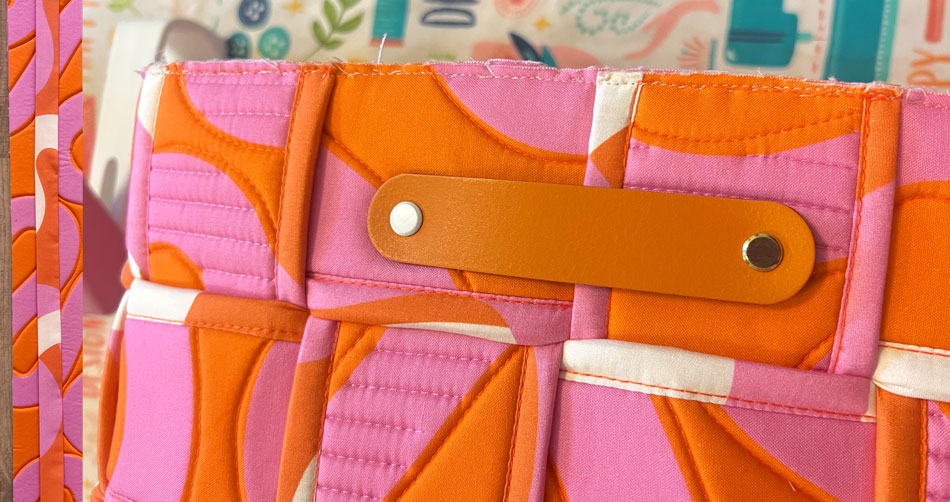 Im inneren dieses Korbes ist der Stoff Stationery Supplies in der Farbe natural aus der Serie Salutations von Ruby Star Society, weil der nämlich auch sehr viel Orange enthält und ich die Kombination daher sehr mochte. Der Außenstoff ist Groove Unspooled Orange Zest und für das Schrägband habe ich den Stoff Groove 108“ Wide Back Tangerine Dream genommen. Ich mag es sehr, dass man erst auf den zweiten Blick sieht, dass es sich hier um unterschiedliche Stoffe handelt, sie aber einfach so harmonisch zusammen aussehen. Was für mich leider nicht mehr dazu passte war die Buchschraube für den Korbgriff. Ich hatte silberne aus dem Bestand genommen und sie fügten sich einfach gar nicht in das Gesamtbild ein. Dann fiel mir ein, dass ich noch Eddingspray besitze und habe erstmal nur eine Schraube testweise weiß angesprüht (EINE silberne hätte ich nämlich zur Not noch gehabt, wenn ich doch bei Silber hätte bleiben wollen.) Aber nein, Weiß war definitiv viiiiel besser!!