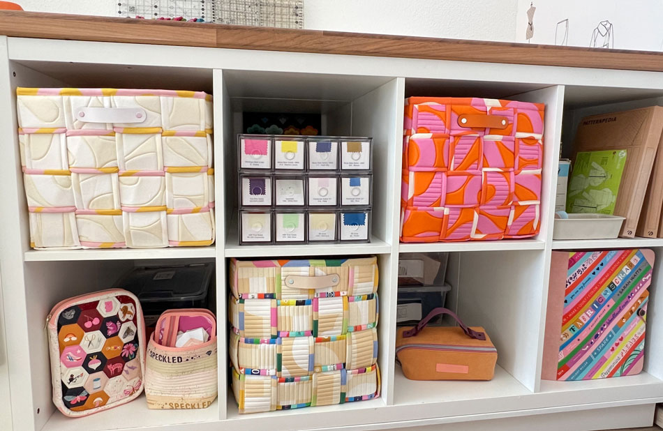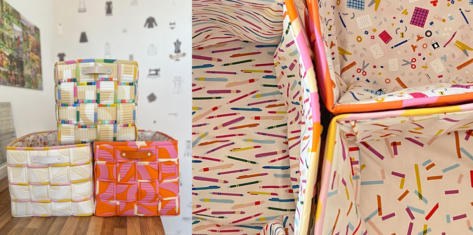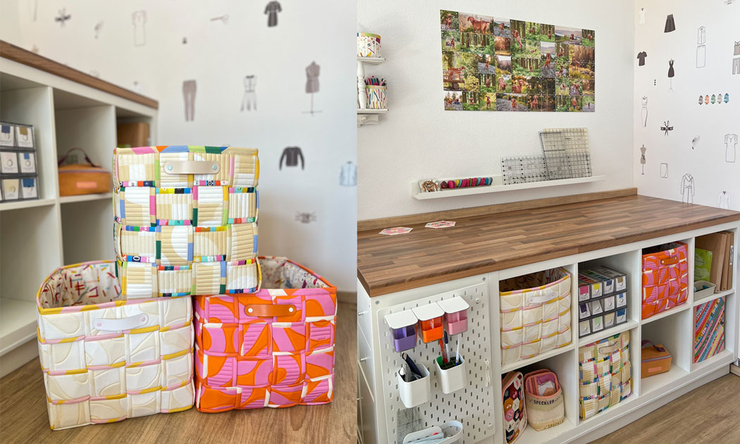 So toll wie oben im linken Bild – frisch nach der Fertigstellung im Sommer 2020 – sah er längst nicht mehr aus. Ich habe kein Vorher-Foto vom Zustand 2025 gemacht, aber es quoll tatsächlich einiges aus den offenen Fächern raus. Und nachdem ich meine Penny sichtbar in ein Fach gestellt habe und auch meine Farbkärtchen ein weiteres Fach bekommen haben, konnte der Rest nicht so schäbig bleiben. Korb Kalle kam also wie gerufen. Und es war dann auch ziemlich schnell klar, dass ich für meine neue Ordnung nicht nur einen großen Kalle benötige sondern gleich drei. Kurz vor der Veröffentlichung von Kalle kamen die Groove Stoffe von Emily van Hoff raus. Leider hatte ich mich etwas zu spät für diese Stoffe entschieden und musste nehmen was „übrig blieb“, denn die Serie war extrem beliebt.