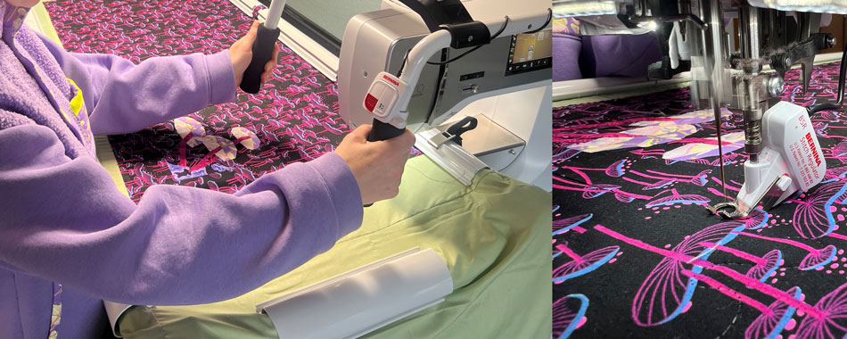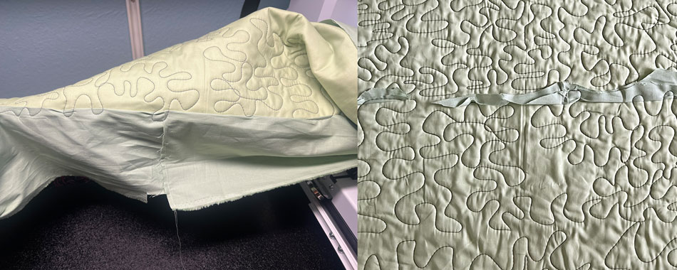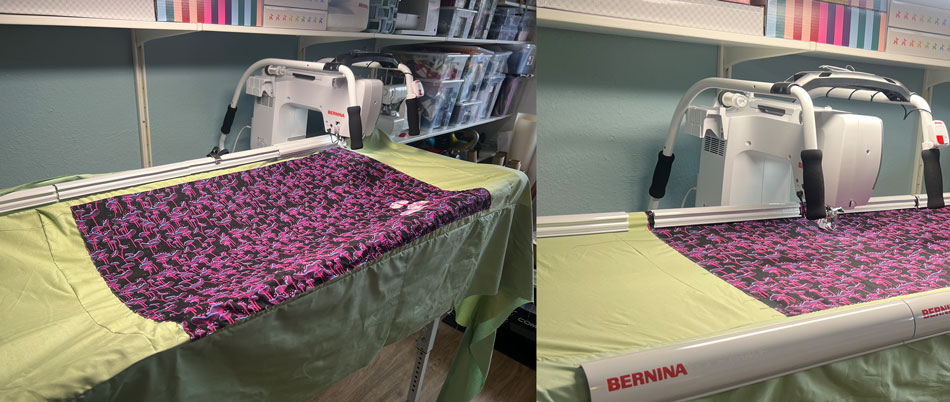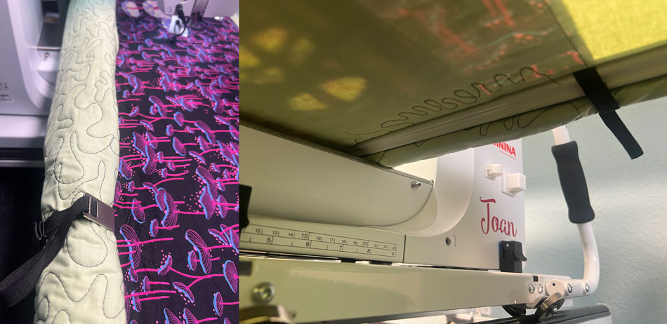 Ich wollte aber von einem Missgeschick erzählen. Nachdem der Stoff neu platziert und wieder eingespannt wird, muss man eigentlich (!!) den hinten überstehenden Stoff einrollen und mithilfe der kleinen Häkchen an der Stange befestigen (der Prozess ist ein wenig anders, wenn man den Schlitten für die Longarmmaschinen z.B. Q16 oder Q24 besitzt.)Mit denen wäre übrigens auch eine größere, bzw. die ganze Quiltfläche nutzbar).