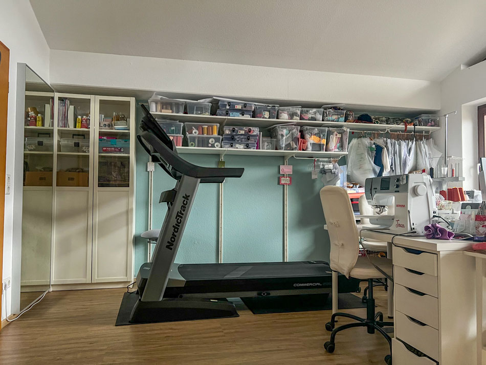 Der steht da allerdings schon eine ganze Weile nicht mehr. Ich mochte es einfach nicht gerne beim Nähen gegen die Wand zu schauen und habe die Tische inzwischen zusammen mitten im Raum angeordnet. Für die Regalwand sah das danach aber schon komisch aus: Dieser freie Platz ohne Regalböden, aber doch eben mit den Regalstreben… Dann stand mein Laufband für eine kurze Zeit davor. Das sah leider auch nicht schön aus, aber ich wollte nicht mehr im dunklen Keller trainieren.