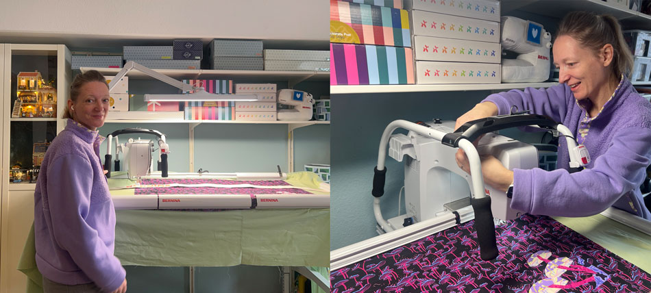 Und selbst mit dem BSR ist es anfangs Übungssache, aber da kam ich dann schnell rein und hatte schnell durchgehend schöne Stiche. Nur die Unterfadenspannung hatte mir anfangs zu schaffen gemacht. Beim Nähen ist die automatische Fadenspannung immer perfekt und ich sehe den Unterfaden nie hervorblitzen. Beim Quilten auf dem Hoop Frame war sie von Anfang an zu sehen und ich habe lange getestet bei welcher Einstellung (die ich natürlich NICHT aufgeschrieben habe) gute Ergebnisse erzielt wurden.