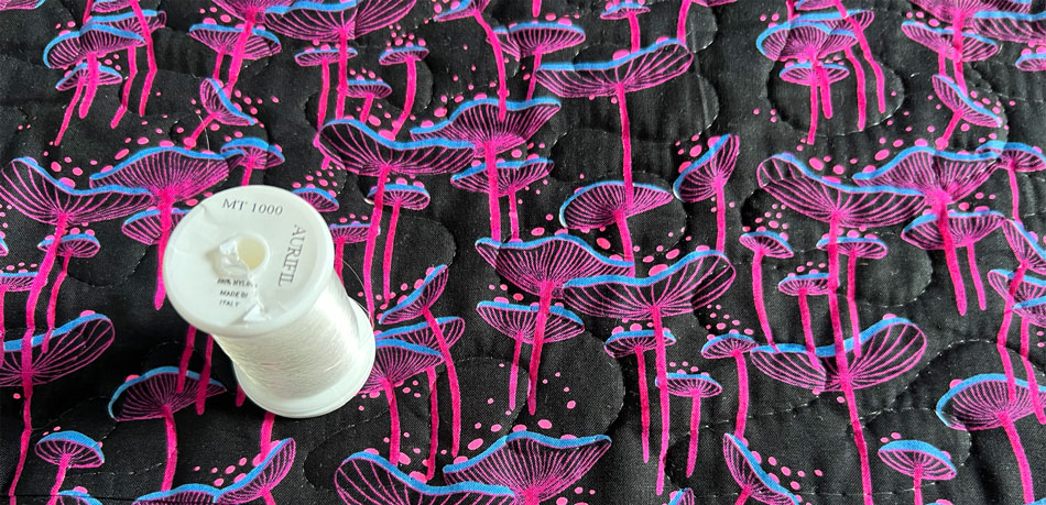 Aber zurück zum Wandbild: Ich konnte mich lange nicht entscheiden mit welcher Farbe ich quilten soll: Schwarz, wie der Hintergrund? Aber dann mit Schwarz über die pinken Stiele rattern? Oder Pink, aber dann in Kauf nehmen, dass das sehr dominant wirkt auf dem schwarzen Hintergrund? Ich bin aber vor kurzem durch einen sehr glücklicken Zufall an das Aurifil Monofilament | Clear vom Quiltwinkel Shop gekommen und habe das auf einem kleinen Stück Fungi Black getestet und fand es perfekt 😃