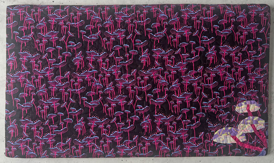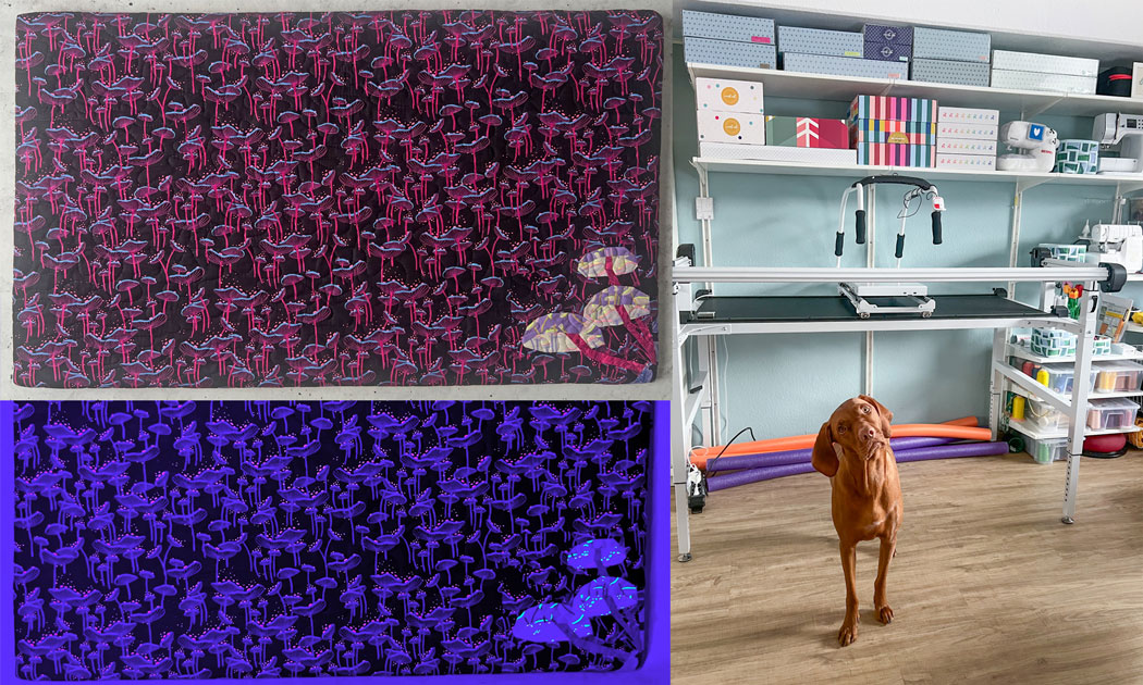 Im letzten Beitrag über den Pepe Pullover habe ich schon angekündigt, dass ich ein Wandbild plane aus den drei Glow Garden Stoffen von Ruby Star Society. Für den Pullover habe ich nur Fungi Amethyst verwendet. Für das Wandbild kommt noch Fungi Natural hinzu, der Star sollte aber Fungi Black werden. Bei diesem Stoff leuchten pinke Punkte über den blau-pinken Pilzen auf schwarzem Hintergrund.