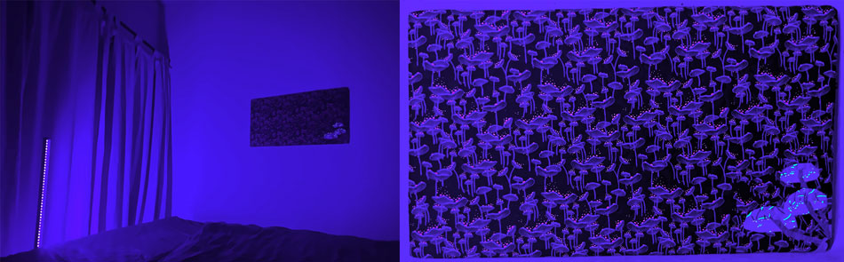 Ich wusste lange nicht wie das Wandbild genau aussehen sollte und die Stoffe wanderten im letzten Jahr erstmal in den Schrank. Aber nachdem der Pepe Pullover nun fertig wurde, war ich hochmotiviert auch das Bild im Anschluss zu nähen und habe mir die Zeit genommen einen Plan zu überlegen. Eigentlich sollte die schwarze Fläche schon sehr groß werden. Aber irgendein kleines Highlight aus den anderen beiden Stoffen wollte ich ebenfalls einfügen. Bei all den Pilzen auf diesem Stoff hätte ich fast das naheliegendste übersehen: Wie wäre es denn mit einem FPP Pilzbild? Das meiste das ich gefunden habe, sah eher nach Fliegenpilz aus oder eben nach Standardpilz: Ein dicker runder Pilzstamm und ein großer bauchiger Kopf. Aber ich wollte so lange schlanke Pilze und wurde dann fündig bei „Lover of Life Designs“. Sie hatte ein Motiv namens „Blue Glow Mushrooms FPP“. Ha! Glow! Hier schließt sich der Kreis doch wieder – die mussten es sein.