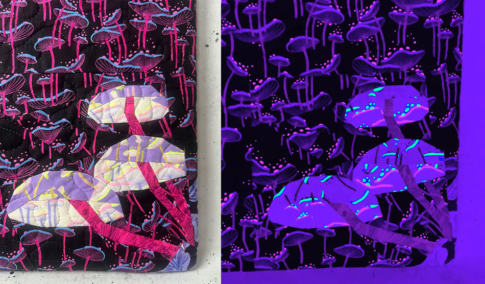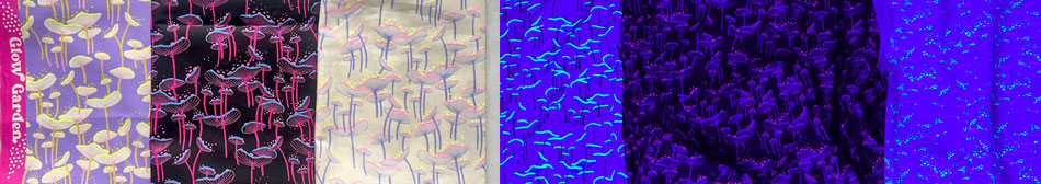 Das Motiv hat allerdings 5 Farben und nicht nur 3, also musste ich schauen, ob ich nicht doch noch 2 weitere leuchtende Stoffe bekomme, obwohl die meisten Stoffe der Serie die ja schon letzten Herbst rauskam ausverkauft sind. Ich habe je ein kleines Stück Ginkgo Light Berry und Fox Bloom Black bestellt. Ich bin davon ausgegangen, dass auch die bei Schwarzlicht leuchten, weil die Beschreibung es hergab. Leider ist das nicht der Fall. Die Beschreibung wurde im Shop für alle Stoffe gleich eingepflegt, obwohl nicht alle die Leuchtfunktion haben. Ich habe auch nirgendwo anders die Info gefunden welche Stoffe dieser Serie denn jetzt leuchten und welche leider nicht 🙁