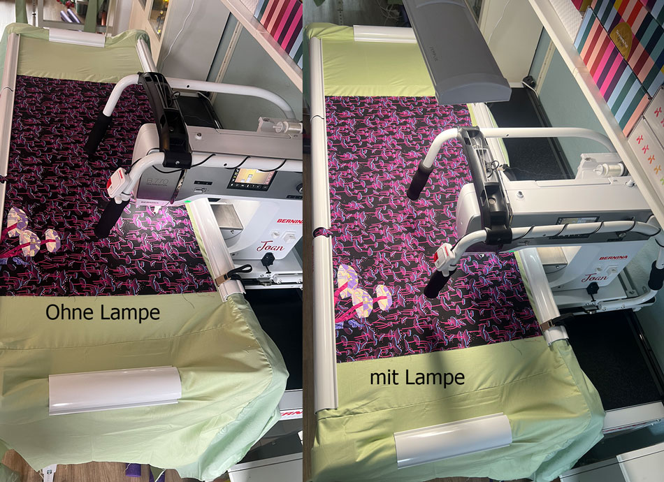Seit Weihnachten habe ich übrigens eine riesige dimmbare und anklemmbare LED Arbeitstischlampe. Sie ist die meiste Zeit des Jahres über meinem Zuschneidetisch angebracht. Es gab aber von vornerhein den Plan, dass ich sie über dem Hoop Frame anbringe, wenn ich quilte. Das habe ich nun gemacht und war sehr begeistert davon wieviel Licht sie mir an dem sehr trüben, dunklen, Wintertag gebracht hat: