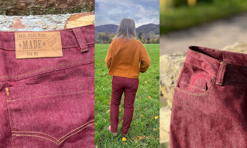 Der Schnitt sieht einen Denim mit 10% Stretch vor. Da hatte ich genau einen im Bestand: Einen Bordeaux-roten Denim, den ich mir 2023 eigentlich farblich passend für einen geplanten Blazer gekauft hatte. Obwohl das Probeteil für den Blazer gut geworden ist, habe ich den eigentlichen Blazer nie genäht und damit auch den Bordeaux Denim nicht mehr angerührt.