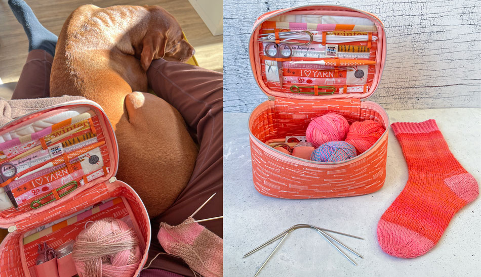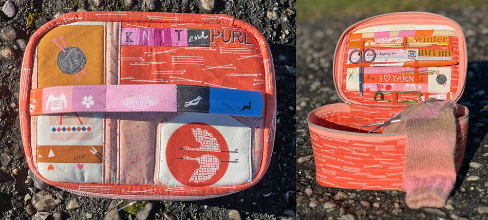 An einem Abend – im Bett strickend – habe ich gerade rechtzeitig vorm Schlafengehen noch die Schere entdeckt die im Bett lag und in der darauffolgenden Nacht bin ich auf einer Häkelnadel liegend wach geworden. So konnte das nicht weitergehen!! Ich hab zwischendurch meinen kleinen Strickbeutel (Stowe Bag) genutzt. Groß genug für meine aktuellen Sockenprojekte. Aber praktisch und übersichtlich…? Eher nicht. Ich habe mir eigentlich mit dem ersten Socken den ich angestrickt habe eine weitere Penny von Spatz&Lux gewünscht: Eine STRICKPENNY in der all mein Strickzubehör für Kleinprojekte wie Socken, Mützen, Mini-Schals seinen festen Platz hat. Und das aktuelle Strickprojekt plus ggf. eine weiteres Knäuel Wolle sollte auch noch reinpassen. Es war recht schnell klar, dass es eine tiefere Penny im Querformat werden soll.