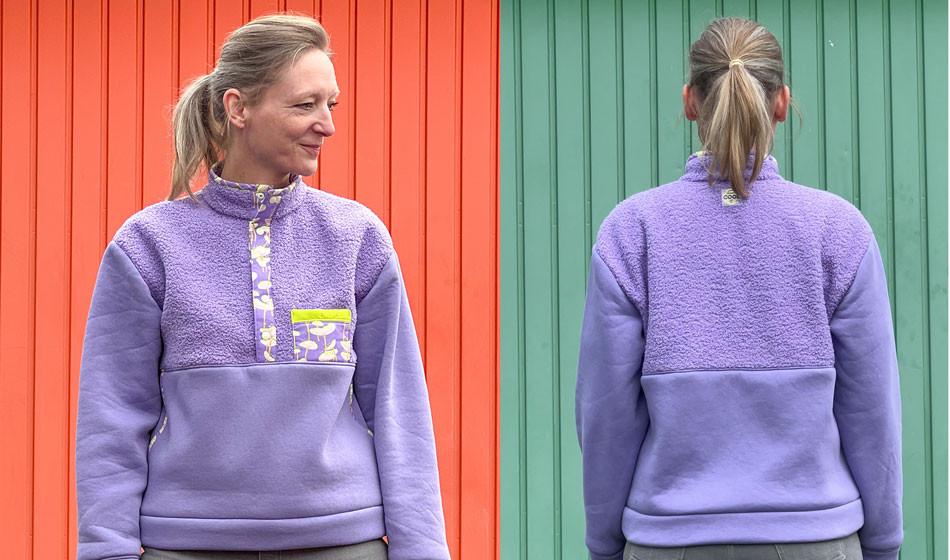 Hey, Du Fliederpilz, ich liebe diesen Troyer mit den Details! Die Farbe und die Kombi mit dem Baumwollstoff – einfach herrlich. Und ich habe die ganze Zeit überlegt, ob der Krageneinsatz verschlusslos ist… Hab einfach die Druckknöpfe erst beim dritten Hinschauen entdeckt! Danke für die Schnittempfehlung. Sowas suche ich nämlich auch noch. LG von Ina