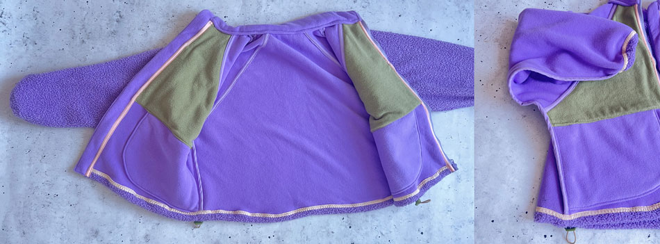 Für das obere rechte Vorderteil auf dem die Tasche angebracht wird, wollte ich gerne eine Kontrastfarbe wobei ich mich dafür am Bestand bedienen wollte. So richtig stimmig war leider nur ein deutlich dünnerer Fleece. Um die Dicke auszugleichen kam mir die Idee den Stoff zweilagig zu verwenden und dann auch gleich so zu vernähen, dass beim Übergang beider Stoffe keine offene Kante zu sehen ist.