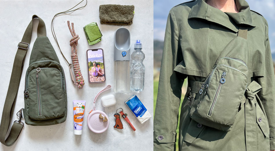 Man sollte meinen, dass ich nun genug „Hundetaschen“ habe. Aber tatsächlich fehlt mir gerade jetzt an den warmen Frühlingstagen die Tasche für jeden Tag. Sobald ich keine Jacken mehr trage (an die ich mir ja auch immer alle möglichen Zusatztaschen nähe), fehlt mir tatsächlich Stauraum für die ganz kleinen Runden. Der kleine Gang zum Hundetreff oder die Minirunde in der Mittagshitze. Da komme ich mir selbst mit dem kleinen Rucksack etwas zu dolle bepackt vor. Aber die Bauchtasche fasst leider keine Wasserflasche und die ist einfach Pflicht, egal wie klein die Runde ist. Wenn Bente mit Hunden tobt oder bei wärmeren Temperaturen unterwegs ist, fragt er mich ziemlich schnell nach Wasser.