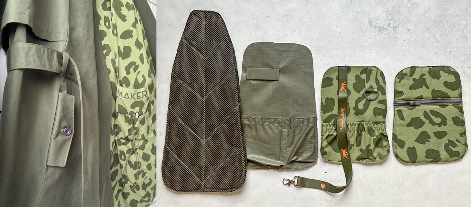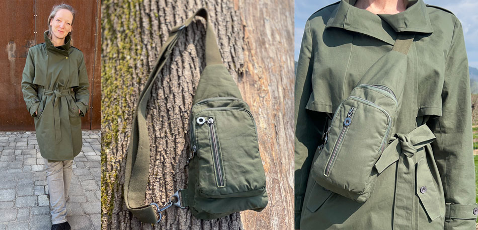 Ich habe den Schnitt übrigens gefunden, als ich gerade mitten in der Planung für meinen Trenchcoat Coquillle war. An dem fehlten mir ja eigentlich auch die sonst so praktischen Taschen meiner Hundejacken. Daher hab ich spontan beschlossen, dass mein erster Heartland Backpack für genau diesen Trenchcoat sein soll. Ich habe ihn aus den Stoffresten des Mantels genäht.