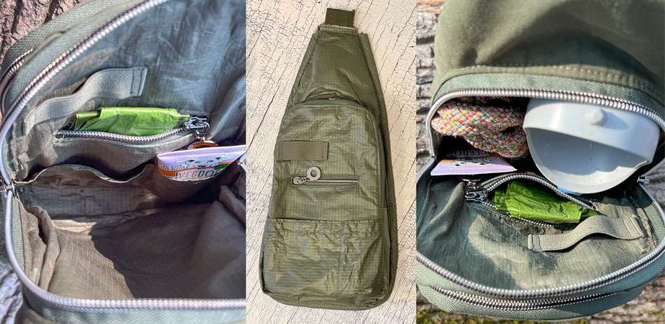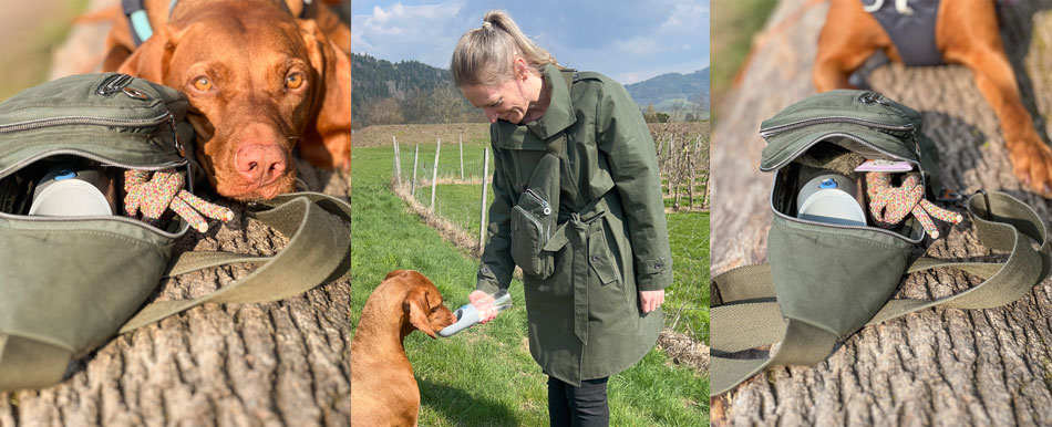 Die Tasche ist geräumig genug um alles wichtige dabei zu haben. Zusätzlich zur Hundewasserflasche passt noch ein Spielzeug…