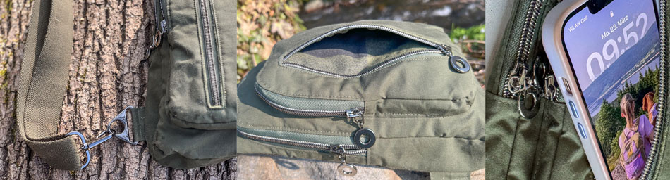 Die Form dieser Tasche ist richtig spannend. Das Fach ist höher als der Reißverschluss (was perfekt ist, weil dadurch die hohe Hundeflasche reinpasst). Aber weil sie oben flach bleibt und der Reißverschluss und die Tiefe erst weiter unten anfängt, wirkt sie deutlich kleiner, ist aber ein kleines Raumwunder: