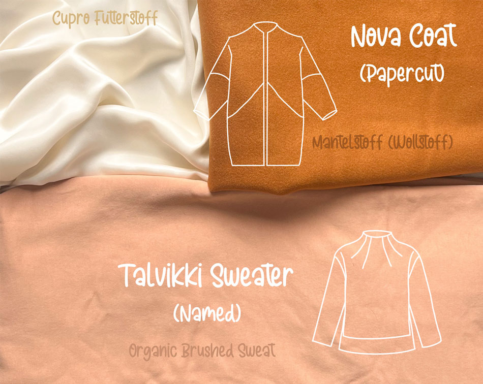 Diesen Stoff habe ich aber nicht nur gewählt, weil ich ihn ausreichender Menge daheim habe. Gekauft habe ich ihn nämlich ursprünglich für ein anderes Projekt. Mir ist vielmehr aufgefallen wie gut mir dieses Apricot (das ja eigentlich „Rose“ heißt, aber wirklich mehr Apricot als Rose ist) zu meinen Mantelstoffen passt: